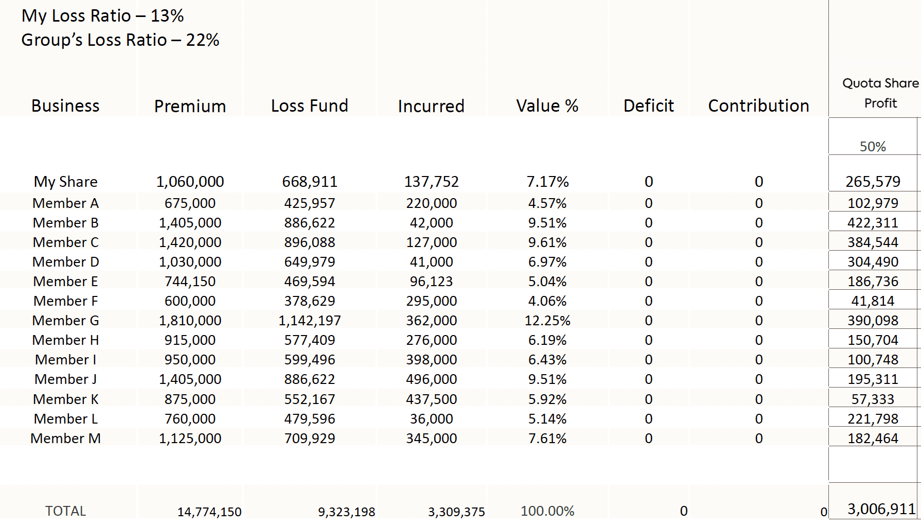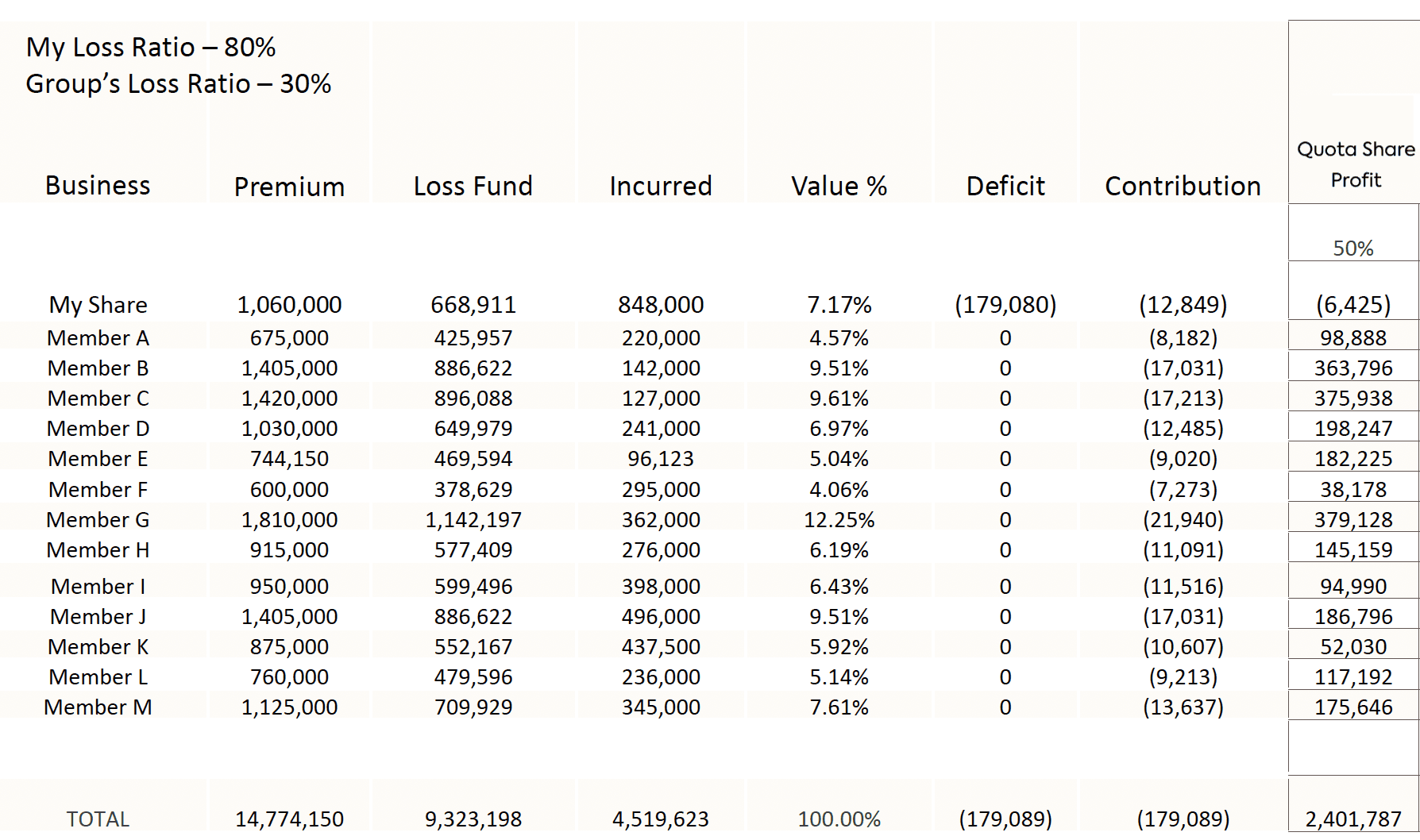 In the second scenario Member A had a difficult year, with a $179,080 deficit. In the shared model other members of the group contribute to this deficit, reducing the severity of the losses. Member A's contribution to their deficit is $12,849 while other members contribute a small percentage of their surplus.